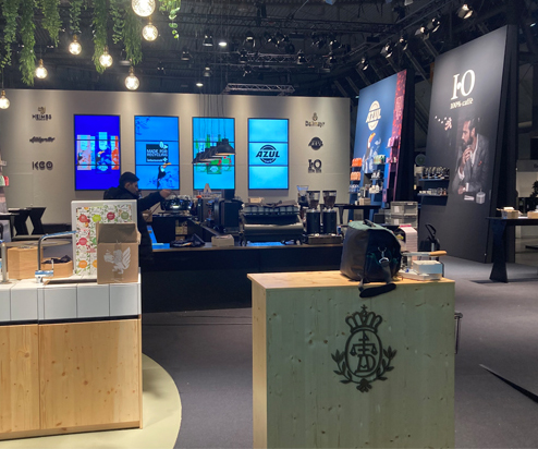 Messestand Kaffeewerkstatt 2023 Mit Theke Bewegung, Hocker Puff, Bank Kaffeewerkstatt, Grafikwänden, Teehaus, Regalen und vielem mehr